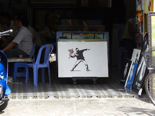 And as far as I know, the new Batman movie isn't out yet. If it was, I would see vendors selling pirate DVD copies outside my hotel. But the publicity photo of Heath Ledger taken during production and that has since been attached to all his obits has already become iconic enough that it's being copied here in oil on canvas.